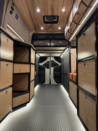 Built for Van Life Outfitters, it features premium finished, a 900ah electrical system, hydronic hot water system, in-house upholstery, and plenty of storage and workspace.