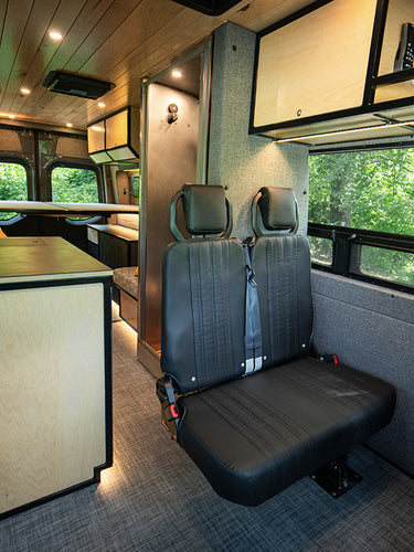 This 144 AWD sprinter just got outfitted with a full interior package, custom rear storage boxes, large electrical system, upper cabinet, custom kitchenette and a three-person factory bench seat.